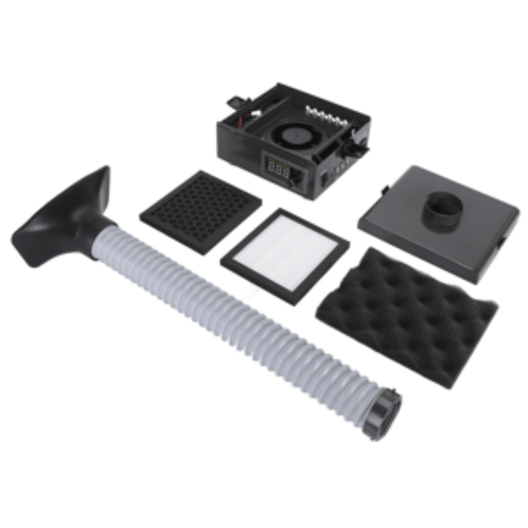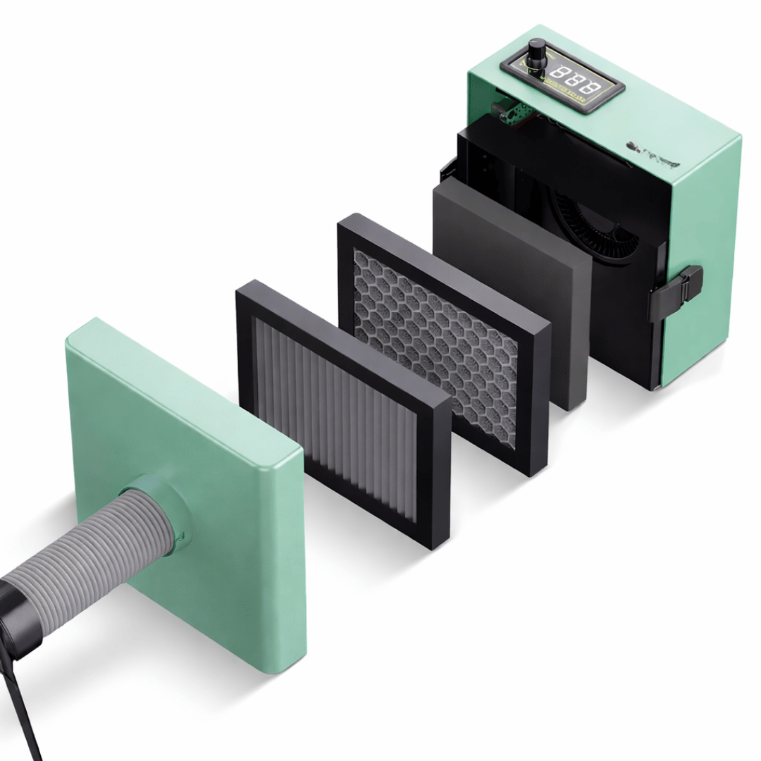 The first high-density filter captures large particles, such as dust and plaster dust; the second, an activated carbon filter, removes odors and VOCs; and the third, a high-efficiency H18 filter, removes at least 99.98% of particles down to 0.3 microns (µm).