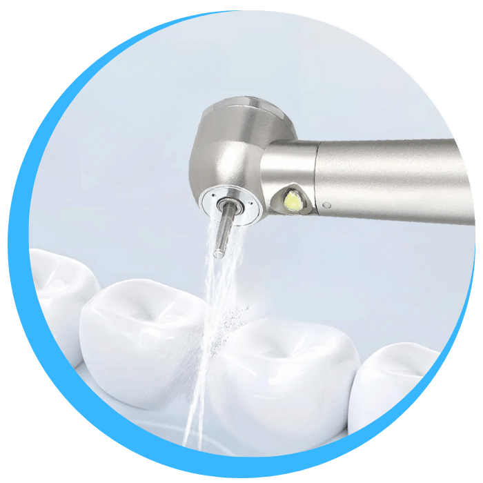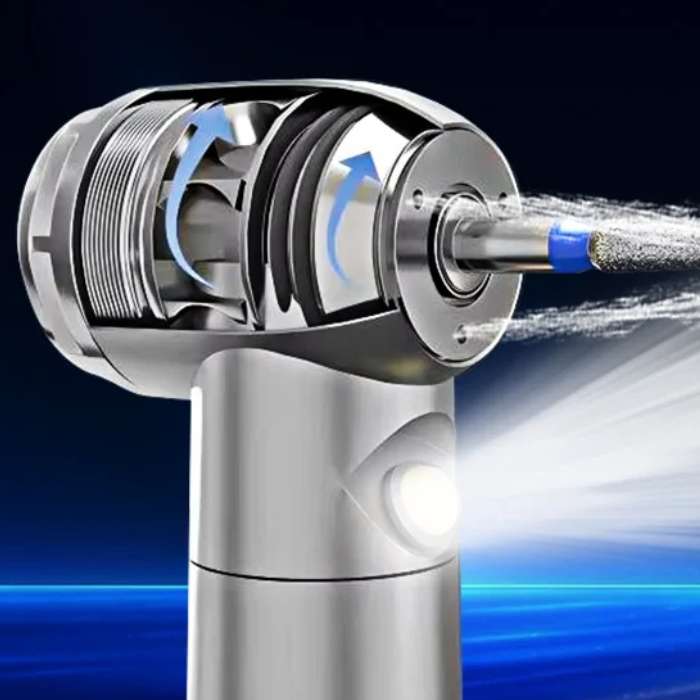 This handpiece has a high rotation speed, which can vary between 280,000 and 350,000 rpm, allowing precise cutting and polishing of teeth and other dental surfaces.