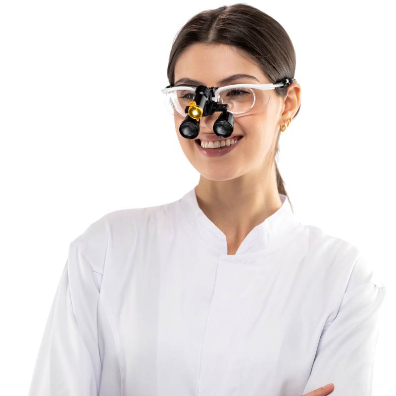 Aluminum loupes with an aluminum-magnesium alloy frame, equipped with internal lenses that adapt to different glasses according to the user's needs.